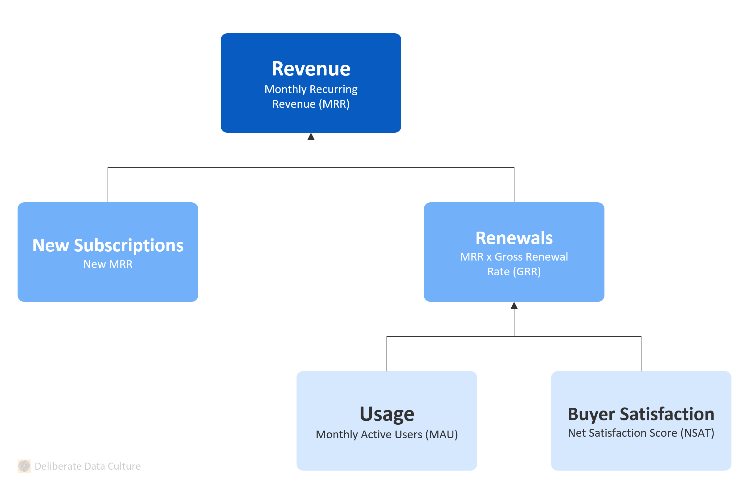 At its simplest, a Metrics Tree is just a box-and-line diagram. Each box is a metric, and each line represents one metric contributing to another. For example, a company with a subscription-based B2B app would articulate Annual or Monthly Recurring Revenue (ARR/MRR) as their topline KPI. Feeding into revenue would be revenue from new subscribers, as well as revenue tied to renewals. Each of those, in turn, have metrics driving them, and so on.