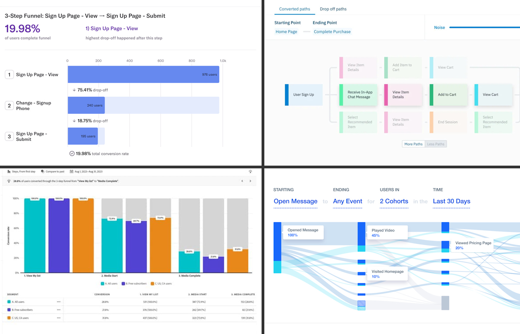 Features to understand user behavior are increasingly must-haves for these platforms, and most of them visualize event data with funnels, task flow diagrams, Sankey diagrams, and/or other tools to take the flood of different events in each user's session, and distill all that information visually.
